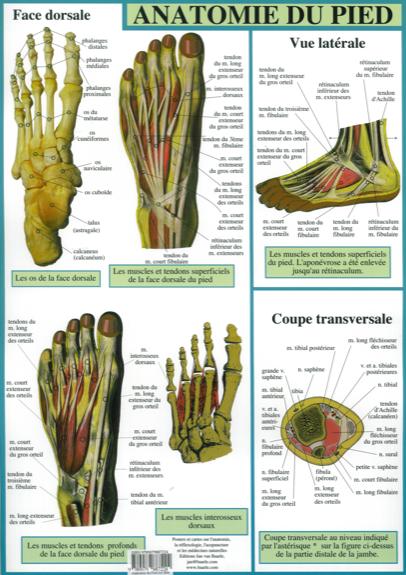 Un format idéal (double A4) pour ces planches classiques d'anatomie du pied. Vues plantaires, dorsales, latérales et transversales montrent les os, muscles et tendons (ainsi que les nerfs et vaissaux sanguins majeurs) superficiels et profonds. Leurs noms sont indiqués selon la nouvelle nomenclature. Format déplié : 42 x 29,7 - Impression couleur recto verso