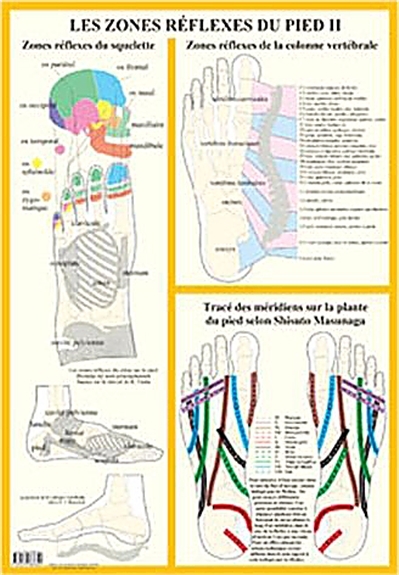 Les cartes de réflexologie montrent le plus souvent surtout les organes. Bien qu’essentielles, ces représentations sont loin d’être complètes. Ce poster présente alors d’autres thèmes moins connus mais importants de la réflexologie plantaire : - les zones réflexes des os du corps, fort utiles pour le traitement de certains troubles, sont représentées de façon détaillée. - Une illustration est consacrée à la projection de la colonne vertébrale, "pilier de la santé", sur le pied. Les organes et troubles spécifiquement associés à chaque vertèbre sont aussi indiqués. - Enfin, les tracés des méridiens selon Masunaga, donne au réflexologue un autre outil puissant provenant de l’acupression (Shiatsu).