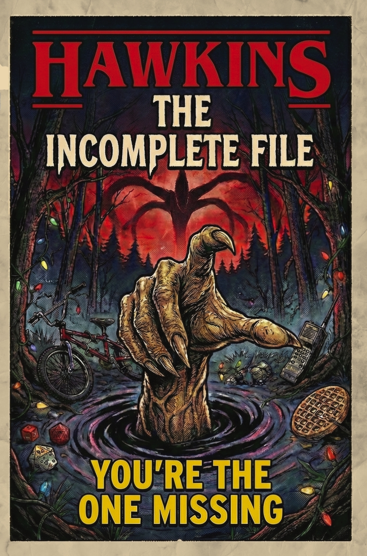 HAWKINS: THE INCOMPLETE FILEDo you feel that? It's not just the air getting colder... it's the realization that YOUR story is the only piece left to find.This is not just a book. It is a classified artifact rescued from the ashes of Hawkins National Laboratory.If your lights flicker without reason, if you still feel the chill of the Upside Down, or if the sound of a cassette tape brings back memories of a lost summer, this dossier was made for you. "Hawkins: The Incomplete File" is a high-stakes, interactive experience that connects our reality to the place where the shadows live.Why this is the ultimate collector's item:Overflowing with stunning, hand-drawn illustrations. Every page is a dark, atmospheric masterpiece designed to be worthy of framing on any fan's wall.BECOME THE FINAL MEMBER OF THE PARTY: You aren't just a reader; you are the missing link. From documenting your own "Friendship Protocols" to establishing your "Rescue Frequency," this file requires your input to be complete.A PSYCHOLOGICAL TRIP TO 1983.The gate is open. The Demogorgon has your scent. There is only one way to close the loop. Get your copy now!