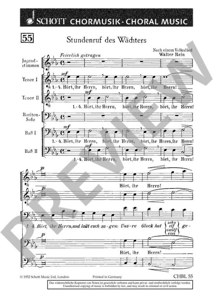 Volkslied "Hört, ihr Herrn und lasst euch sagen". men's choir (TTBB), solo (Bar) and children's choir (SA). Partition de chœur.