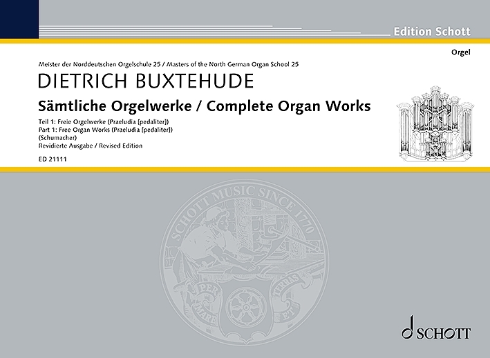 Seit rund 150 Jahren (Philipp Spitta, Erstausgabe: Dietr. Buxtehude’s Orgelcompositionen, Leipzig 1876/1877) quält sich die Buxtehude-Forschung mit einer sehr unzuverlässigen Quellenlage. Ab 1971 vermochte Klaus Beckmann mit Hilfe der professionellen Methode ›Innere Textkritik‹ zahlreiche Überlieferungsdefizite zu identifizieren und zu emendieren, darunter 73 Takte in fehlerhafter 4/4-Taktart (statt 3/4) in der Toccata d-Moll / BuxWV 155. Weitere Forschungen förderten entscheidende Erkenntnisse zur Verfasserschaftsfrage ebenso wie zur Textfrage zutage, darunter die Entdeckung des Umkehrbaren oder Doppelten Kontrapunkts bei 14 von 18 Praeludia oder die einschneidenden Korrekturen beim Te Deum Buxtehudes. Die erstaunlich umfangreichen, in jedem Fall wissenschaftlich fundierten Text-Optimierungen sind in die von Claudia Schumacher, Beckmanns Schülerin, herausgegebenen Buxtehude-Revisionen (SCHOTT 2021, 2023) übernommen worden. Es ist die einzige von allen Buxtehude-Ausgaben mit diesen authentischen Lesarten. Band 1 enthält 18 Praeludien (pedaliter), Teil 2 drei Toccaten, ein Praeambulum, 2 Ciaconen, 9 Canzonas und 3 Fugen. Schwierigkeitsgrad: 3