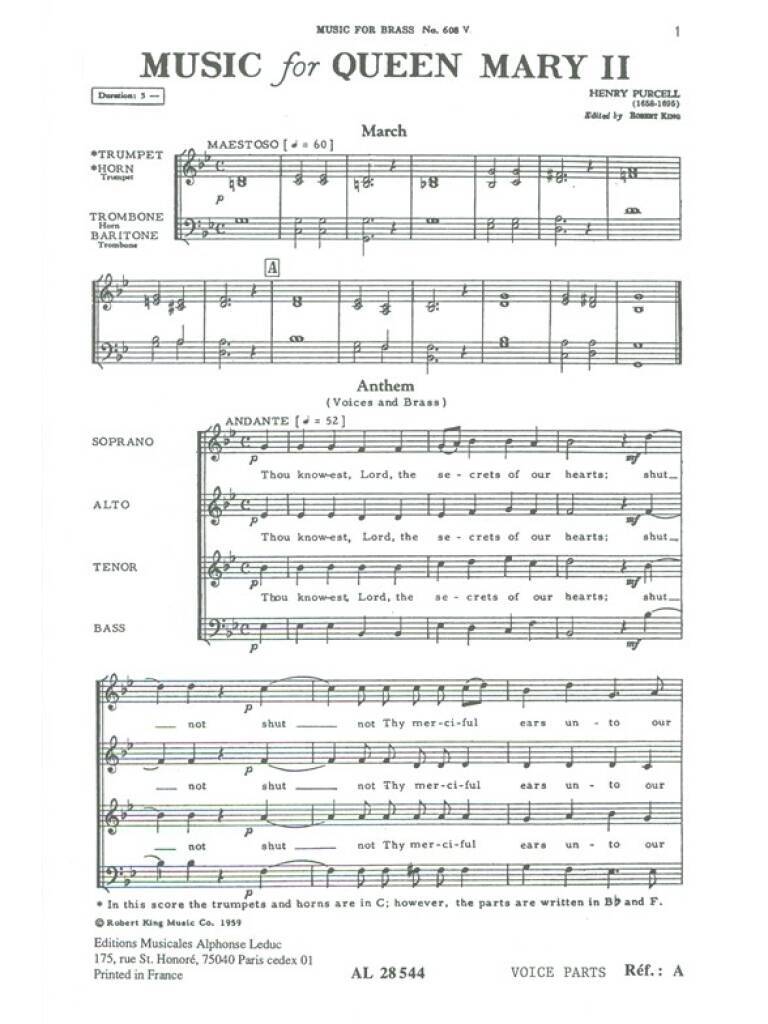 PURCELL MUSIC FOR QUEEN MARY 2 BRASS QUARTET & CHOIR VOCAL SCORE