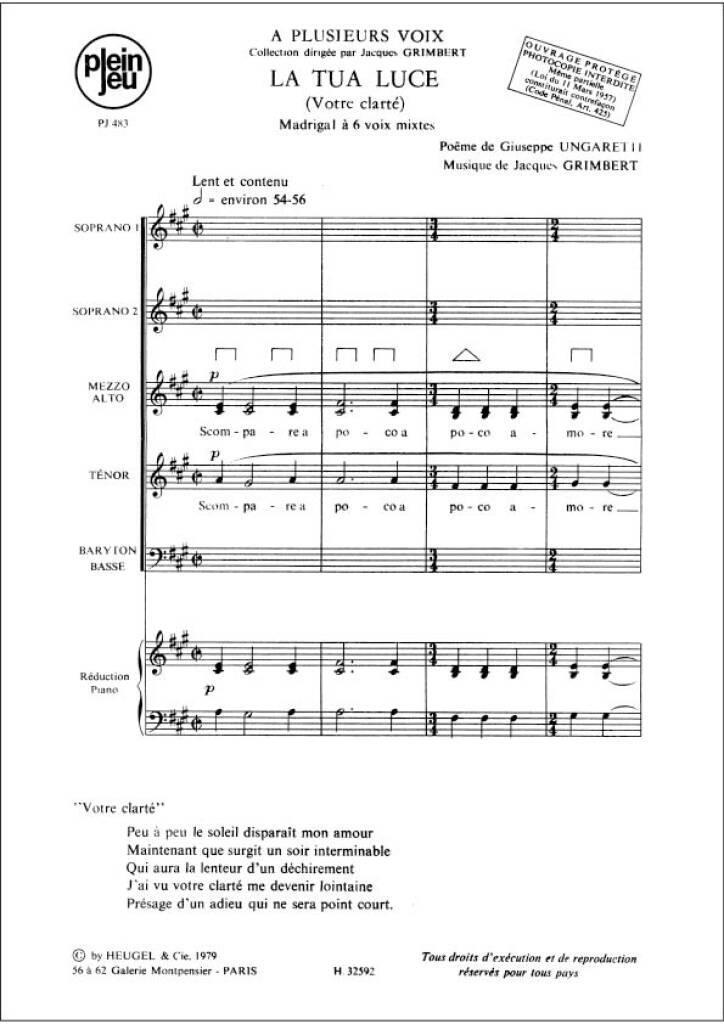 UNGARETTI GRIMBERT A PLUSIEURS VOIS PJ483 LA TUA LUCE 6 PART & PIANO