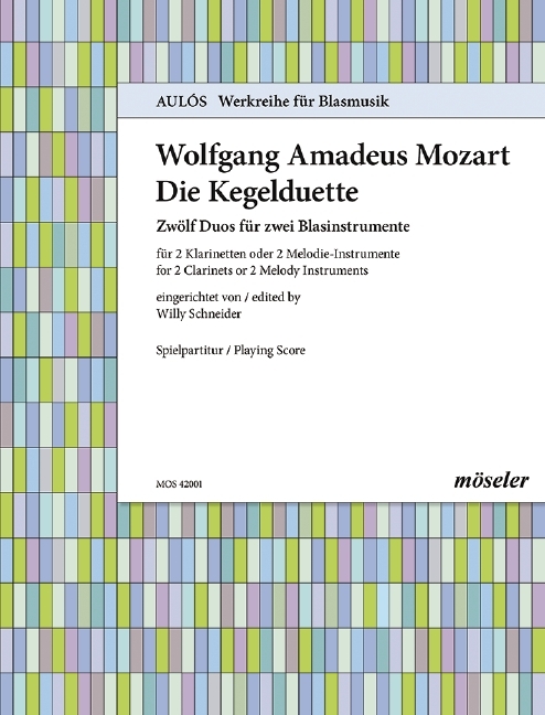 Vermutlich für zwei Bassetthörner gedacht sind die "Zwölf Duos für zwei Blasinstrumente". Das Autograph trägt die Überschrift "Di Wolfgang Amadé Mozart mp. Wien den 27t Jullius 1786 untern Kegelschieben", was den Duetten - Meisterwerke ihrer Art - den Namen "Kegel-Duette" eintrug. Schwierigkeitsgrad: 3
