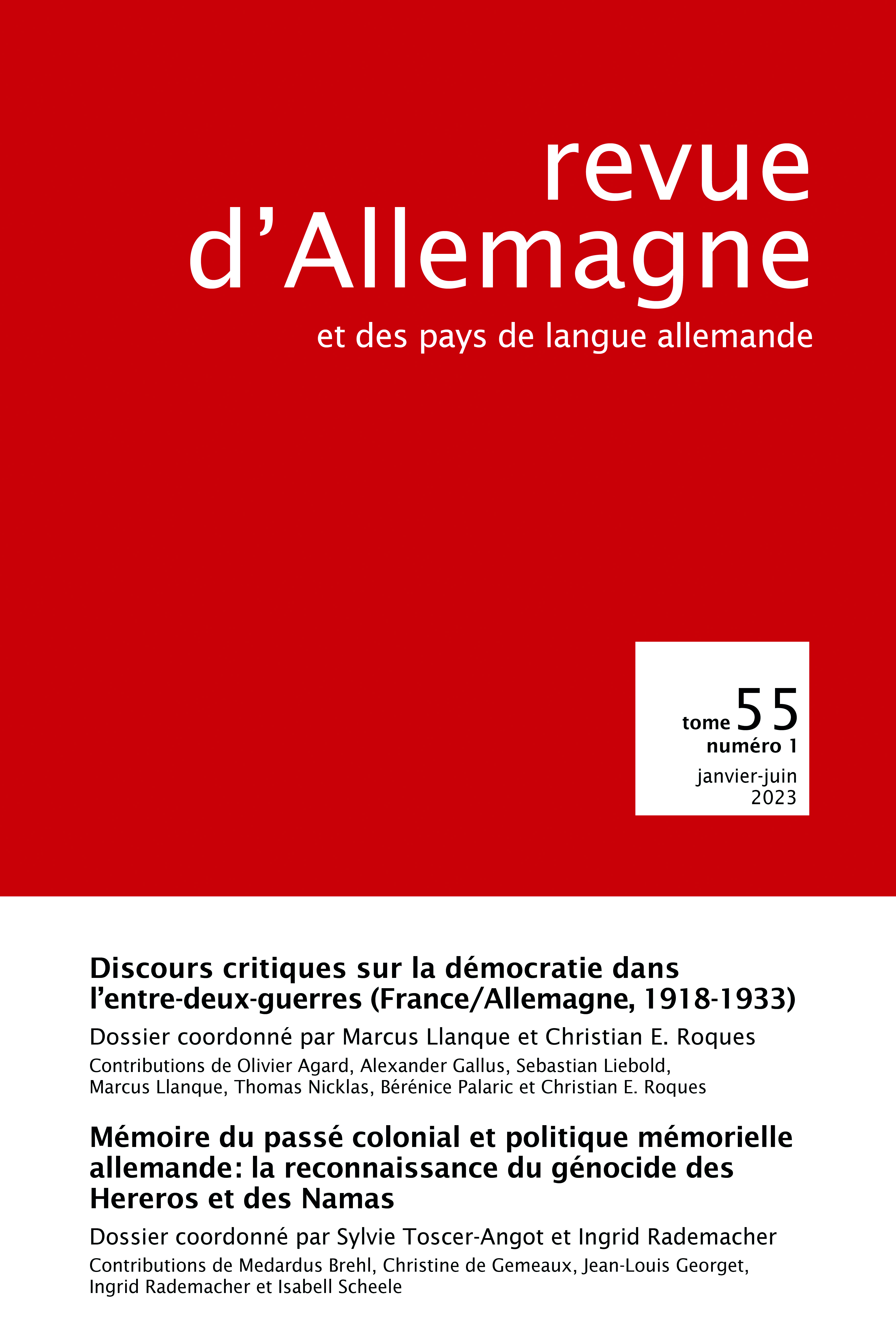 À partir de textes littéraires, politiques, économiques ou de presse, les contributions du premier dossier s’interrogent sur les limites, la crise et la critique de la démocratie en Allemagne et en France pendant l’entre-deux-guerres. Basées sur différentes approches (historiques, juridiques, ethnologiques, culturelles), les contributions du second dossier permettent d’éclairer le processus de relecture critique et de reconnaissance du passé colonial allemand, qui est loin d’être achevé et n’est pas exempt de critiques et de controverses. À partir de textes littéraires, politiques, économiques ou de presse, les contributions du premier dossier s’interrogent sur les limites, la crise et la critique de la démocratie en Allemagne et en France pendant l’entre-deux-guerres. Basées sur différentes approches (historiques, juridiques, ethnologiques, culturelles), les contributions du second dossier permettent d’éclairer le processus de relecture critique et de reconnaissance du passé colonial allemand, qui est loin d’être achevé et n’est pas exempt de critiques et de controverses.