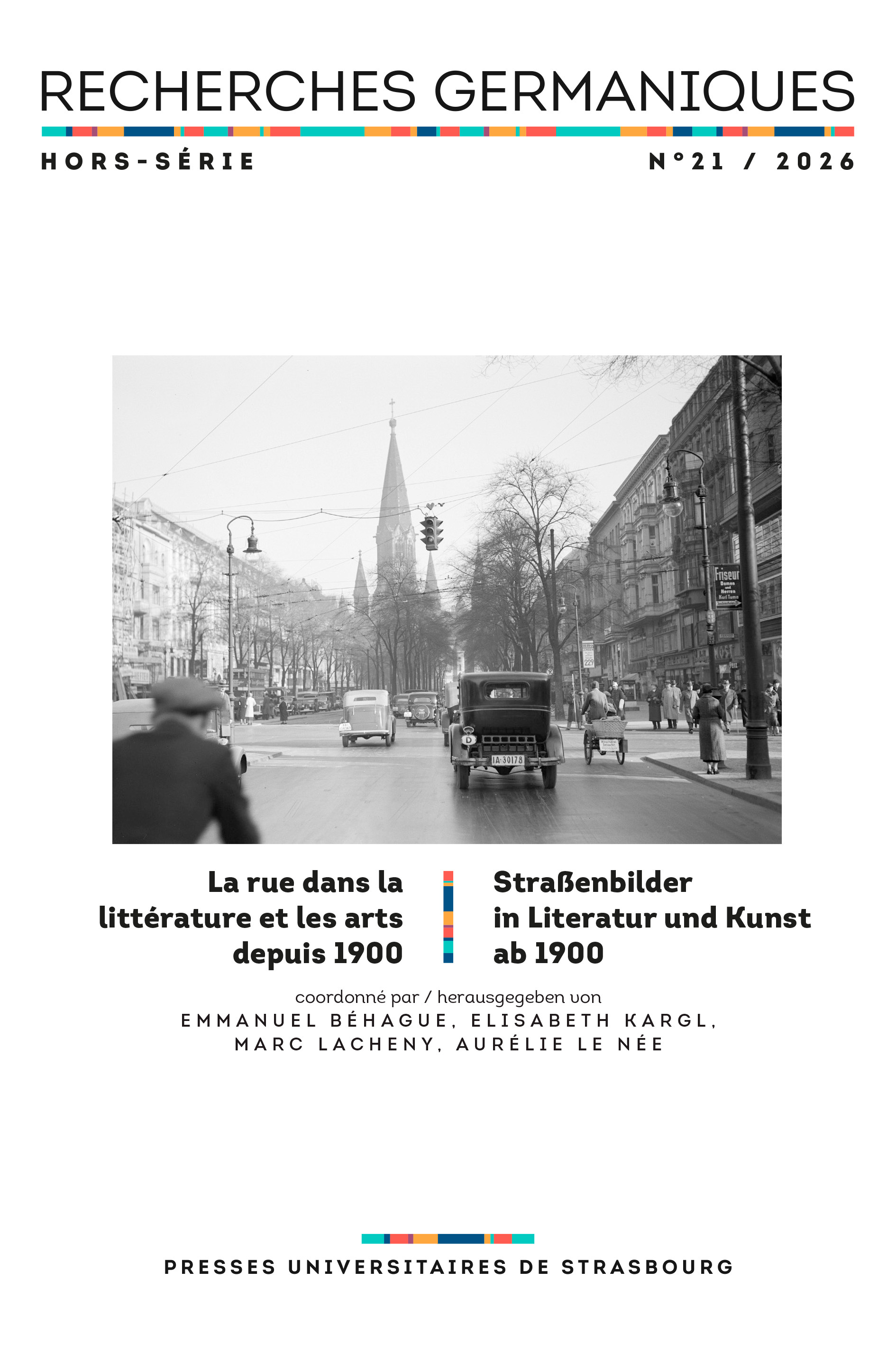Quelles représentations de la rue dans la littérature et les arts germaniques du xx e siècle ? Réponses avec – entre autres – l’écrivain Kafka, le dramaturge Peter Handke, le poète Heiner Müller, le photographe Arno Fischer et l e cinéaste Wim Wenders. La rue est un motif récurrent dans les arts et la littérature, tout particulièrement depuis le début du xixe siècle. Elle est au centre des quinze contributions qui composent ce numéro et portent sur la littérature, la photographie et le cinéma dans l’espace germanophone et yiddish. Lieu de flânerie, elle est aussi le cadre de situations sociales difficiles, pour des personnes marginalisées ou en temps de guerre, et elle constitue un point de rencontre entre passé et présent. Entre espace public et espace privé, la rue stimule la création littéraire et artistique depuis des décennies. Le présent numéro cherche à interroger ces différentes formes de création du xixe au xxie siècle, en abordant des figures incontournables comme Franz Kafka, Peter Handke, Heiner Müller ou Wim Wenders, mais aussi en faisant découvrir des productions ultracontemporaines et en ouvrant sur des approches socio-historiques.
