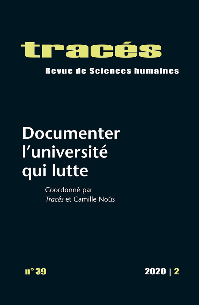 2020 a été une année particulière à bien des égards: le Covid-19, mais aussi la forte mobilisation contre la loi de programmation de la recherche en France, y compris au sein des revues de sciences humaines et sociales qui ont été nombreuses à se positionner en lutte. Tracés , comme d'autres revues, s’est déclarée en grève puis a repris ses activités au cours d’un printemps pas comme les autres… C’est dans ces conditions qu’est adoptée l’idée de chambouler notre calendrier, de changer la thématique prévue pour ce numéro. Il nous importait de faire un numéro mobilisé qui rende compte de ce qui s’est joué au cours de cette année inhabituelle. Et puisqu’il n’était pas possible dans cette temporalité de fabriquer des articles comme nous le faisions habituellement, l’enjeu est devenu précisément de penser et de faire un pas de côté par rapport à nos manières de faire, et par rapport aux contenus mêmes qui sont les nôtres. Documenter, c’est faire ce pas de côté aussi comme manière de refuser une course à l’excellence qui nous demande de produire plus et plus vite, et dans un système d’évaluation toujours plus global et complexe. Plus qu’une autocritique, ce numéro suggère de se repositionner au sein d’un processus temporel scientifique dans une nécessaire et salutaire lenteur, et donc de prêter plus d’attention à la matière des sciences humaines et sociales, ainsi qu’à la fabrique de ses écritures.