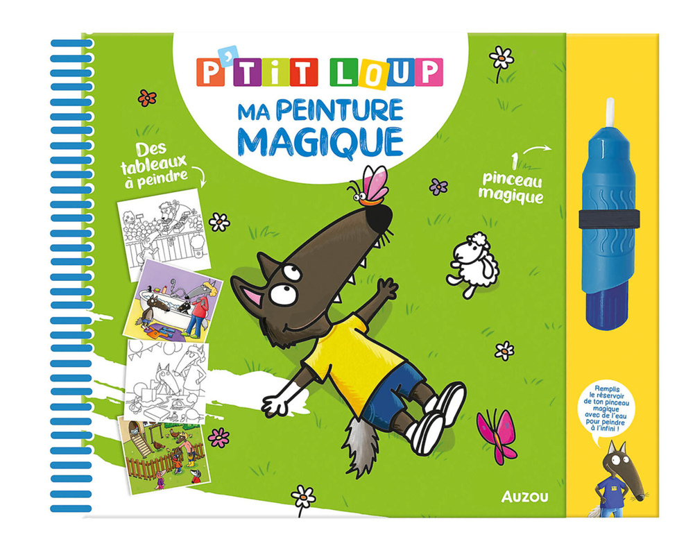 Découvre la peinture magique avec P'tit Loup et son pinceau magique ! Un nouveau format pour les peintures magiques de P'tit Loup : un carnet à spirale avec un pinceau magique ! L'enfant remplit le réservoir du pinceau avec de l'eau et c'est prêt ! 9 tableaux inédits en peinture magique.