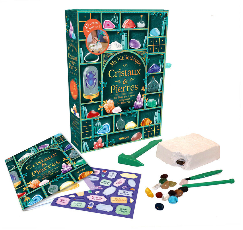 Une bibliothèque pour ranger tes cristaux et tes pierres ! Grâce à tes outils, retrouve tes pierres naturelles dans le bloc d'argile. Range tes pierres dans ta bibliothèque et personnalise-la grâce aux autocollants. Il te restera encore de la place pour ranger tes trouvailles. Dans ton livret détaillé, tu trouveras des informations passionnantes et de quoi noter tout ce que tu veux !