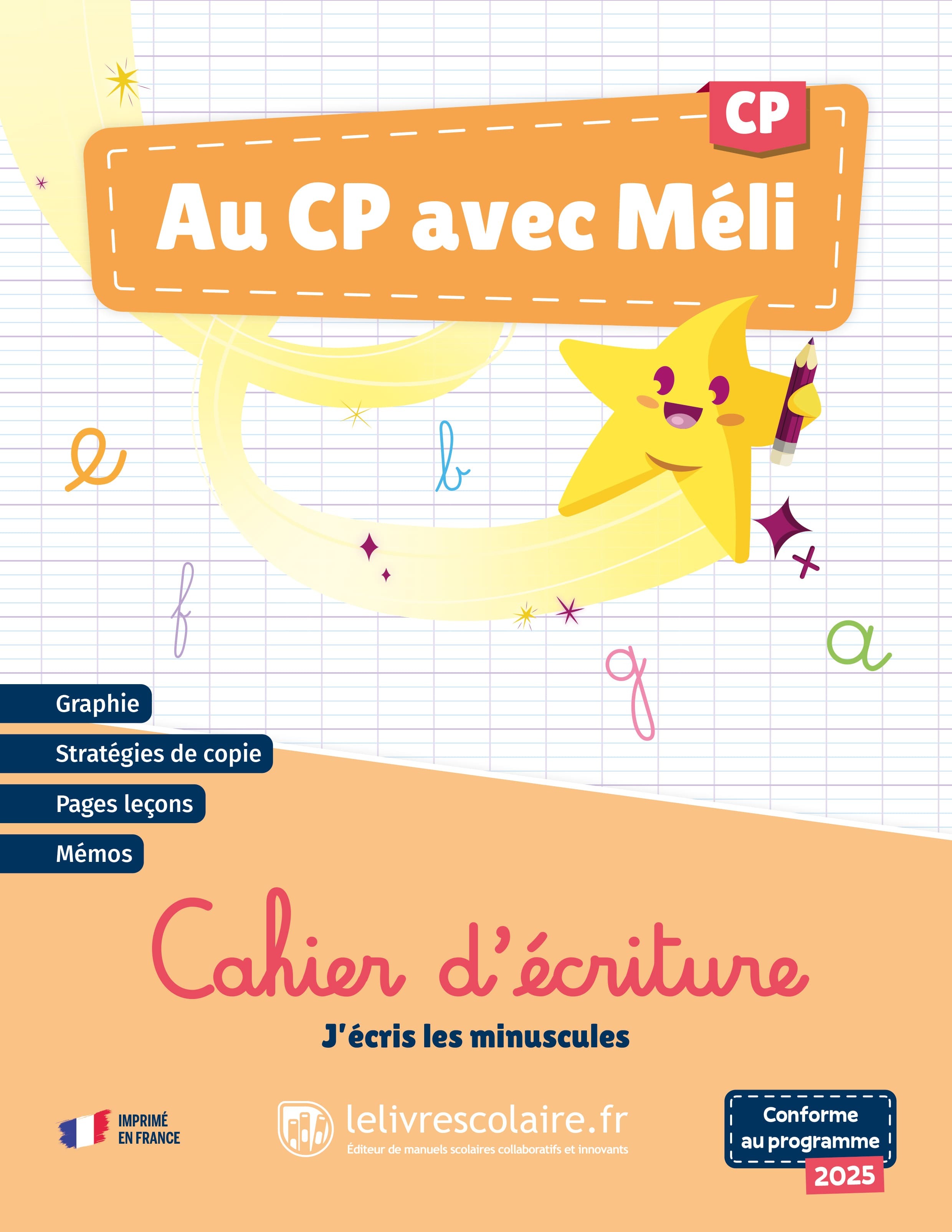 - Le cahier suit la progression du manuel de lecture Au CP avec Méli et s’appuie sur le vocabulaire du manuel. Il peut aussi s’utiliser de manière indépendante. - Ce cahier est adapté à tous : en petit format, il propose des modèles d’écriture pour les gauchers et les droitiers. - Il comprend des exercices de graphie pour travailler le tracé des lettres (tracé du graphème en minuscule cursive et majuscule scripte, et syllabe), et des exercices de copie (copie de mot, copie cachée, copie de phrase, copie à distance) pour appliquer les stratégies de copie vues dans les pages "Leçon". - Le cahier est également pourvu de deux rabats pour travailler la copie cachée.