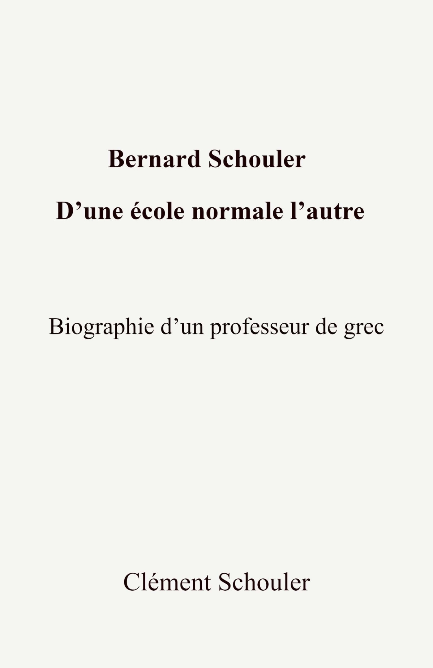 Bernard Schouler est un universitaire à la fois représentatif de son époque, mais également original. Représentatif de son époque, car, enfant, il a été marqué par la guerre et en a conçu la conviction de la nécessité de nous en préserver et a été, jeune adulte, plongé dans le chaudron algérien. Original, car tout en consacrant ses recherches universitaires à la Grèce antique, il en étudie une période méconnue et son parcours mène ce fils d'instituteurs issus des écoles normales sur les bancs de l'École normale supérieure et, en fin de carrière, à la tête d'un institut universitaire de formation des maîtres. La présente biographie a pour but d'exaucer un de ses voeux formulé comme un regret : les institutions remplacent souvent les individus qui les composent comme s'ils n'étaient que les rouages d'une mécanique. Rarement, elles ne gardent de ceux qui les font fonctionner un souvenir, un portrait, une biographie. Il fallait donc la faire.