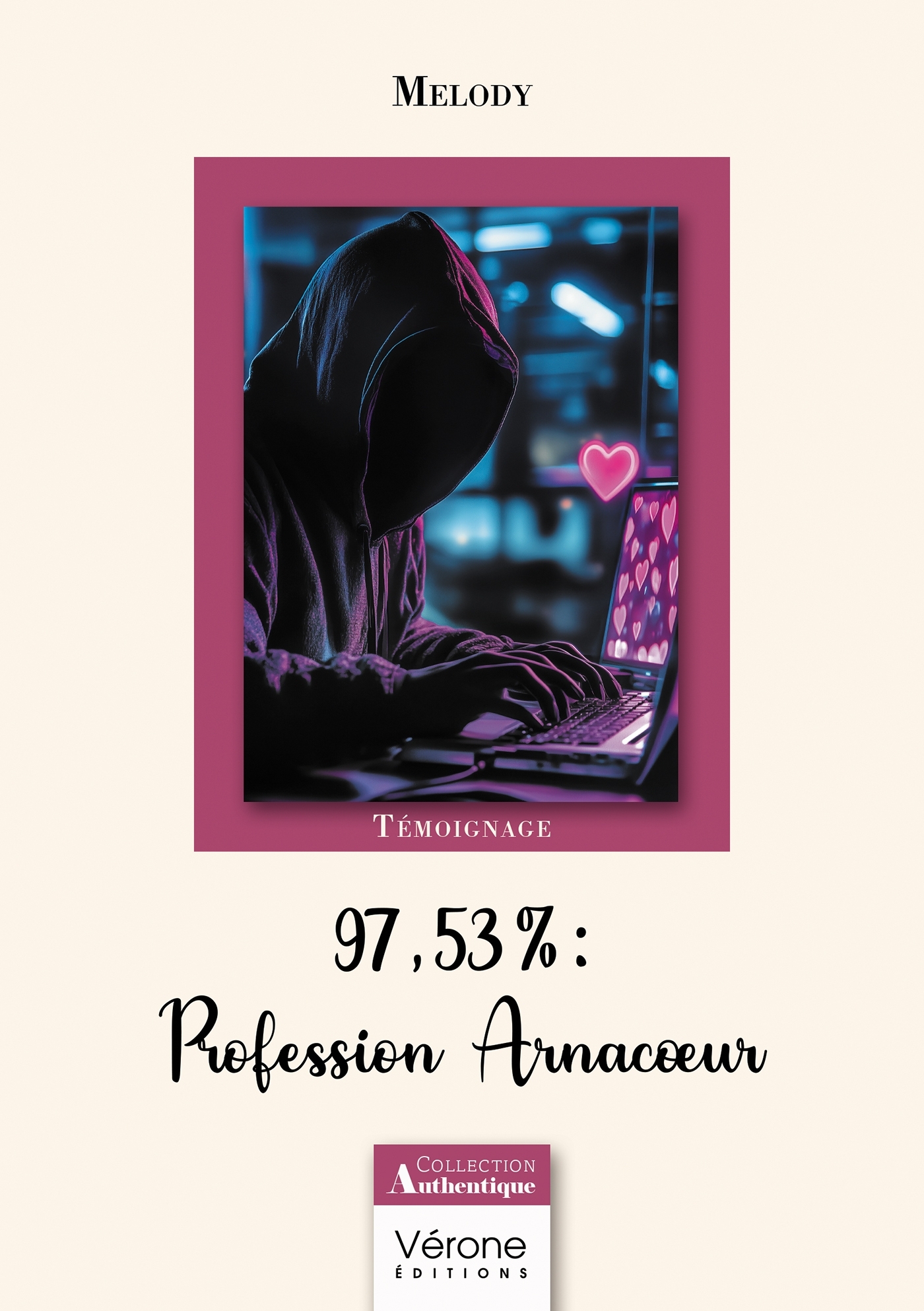 Le livre que vous avez en main est le récit d'une arnaque absolument incroyable, du fait de sa sophistication, son machiavélisme et la perversité de ses auteurs. C'est aussi le récit au jour le jour du parcours d'une véritable combattante, sa victime, aveuglée par sa confiance et entraînée dans les bas-fonds du mensonge au risque de voir sa vie brisée. Mais c'est surtout un témoignage sur le courage, la lucidité et l'amitié, qui ont finalement pu sauver Melody. Melody est née en 1976, elle élève seule sa fille à Toulouse. 97,53 % : Profession Arnacoeur est son premier roman. Cette histoire est la sienne et tout y est parfaitement authentique. La retranscrire a été très douloureux mais salvateur, et la partager lui donne l'espoir d'être utile à d'autres victimes.