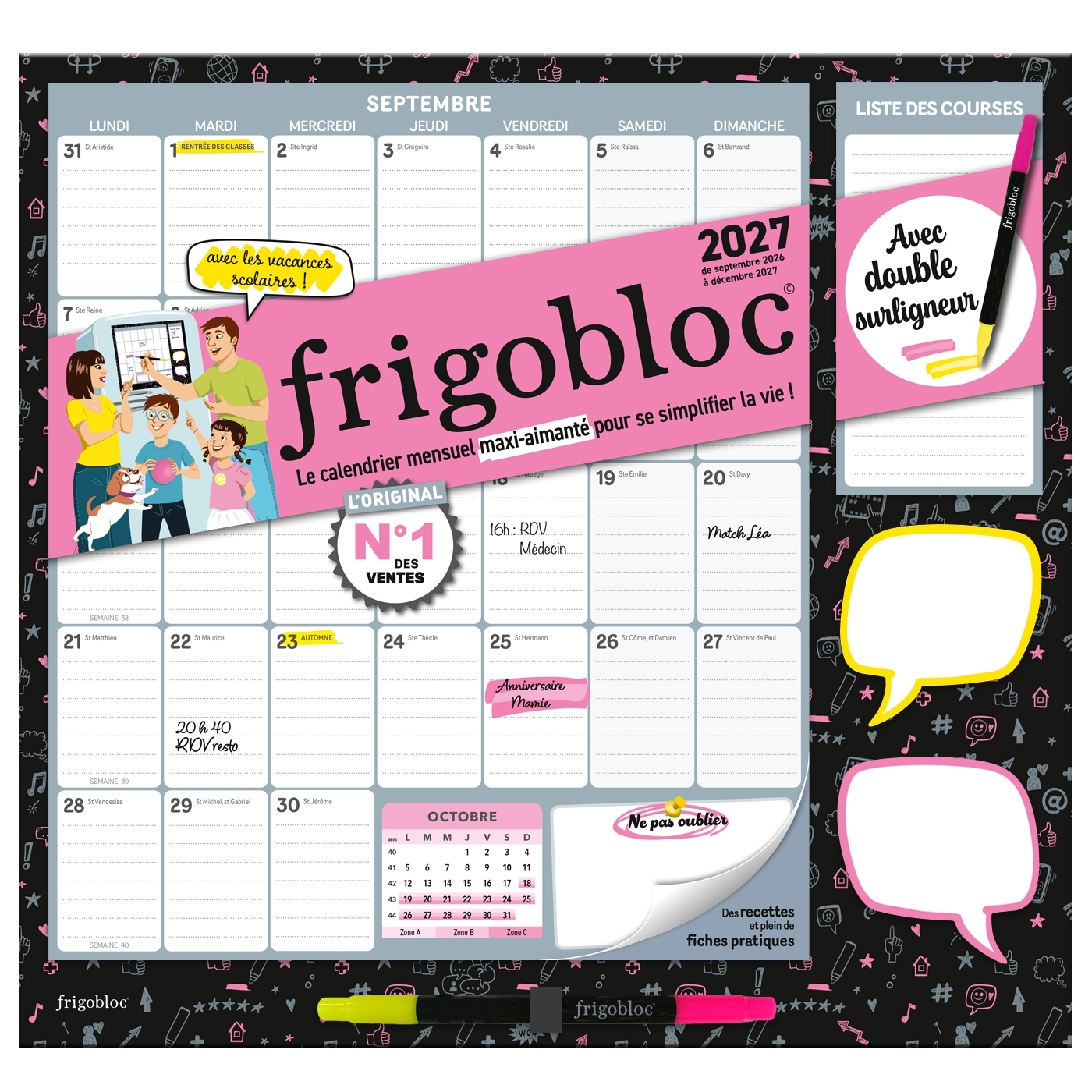 FRIGOBLOC©, CHOISISSEZ L'ORIGINAL ! La marque N°1 des ventes de calendriers familiaux vous présente son édition mensuelle avec surligneur fluo deux couleurs pour mettre en avant vos RDV importants. Le calendrier qui tient sur TOUS les frigos ( même bombés ) grâce à son maxi aimant déjà intégré ! Avec les dates officielles des vacances scolaires ! Planifiez tout de septembre 2026 à décembre 2027 (16 mois) avec ce calendrier maxi-aimanté. Grâce à ses grandes cases hyper pratiques, le planning d'organisation par mois permet de tout noter et de ne rien rater de la vie familiale ! Avec en bonus : - de nombreuses recettes et astuces cuisine (100% renouvelées), - un bloc de listes de courses, - des notes repositionnables, - deux emplois du temps, - des fiches pratiques pour gérer le quotidien (numéros utiles, tableau de mission, to-do list des vacances, règles de la famille...), - un stylo fluos 2 couleurs (jaune et rose) ludique et astucieux ! Et toujours une qualité IRRÉPROCHABLE sans hausse de prix : maxi aimant (le + gros du marché !), colle super forte pour tenir les blocs, support maxi solide et finitions soignées ! S'organiser n'a jamais été aussi simple !