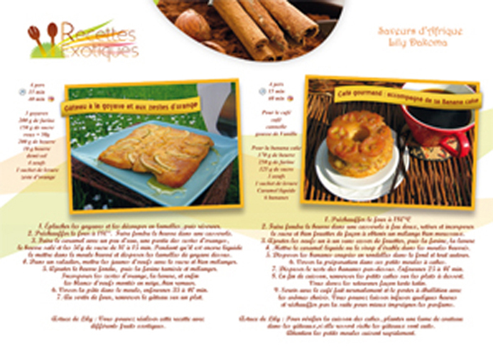 Format 10*15 Exclusivité des Editions Recettes Exotiques Gâteau à la goyave de Lily Dakoma * Banana cake * Ragoût de patates douces Venez tester et découvrir nos recettes ! Étonnez-vos proches avec des recettes aux parfums d'ailleurs ! Laissez-vous tenter par nos recettes authentiques ! 3 savoureuses recettes : simples, faciles et rapides à réaliser !