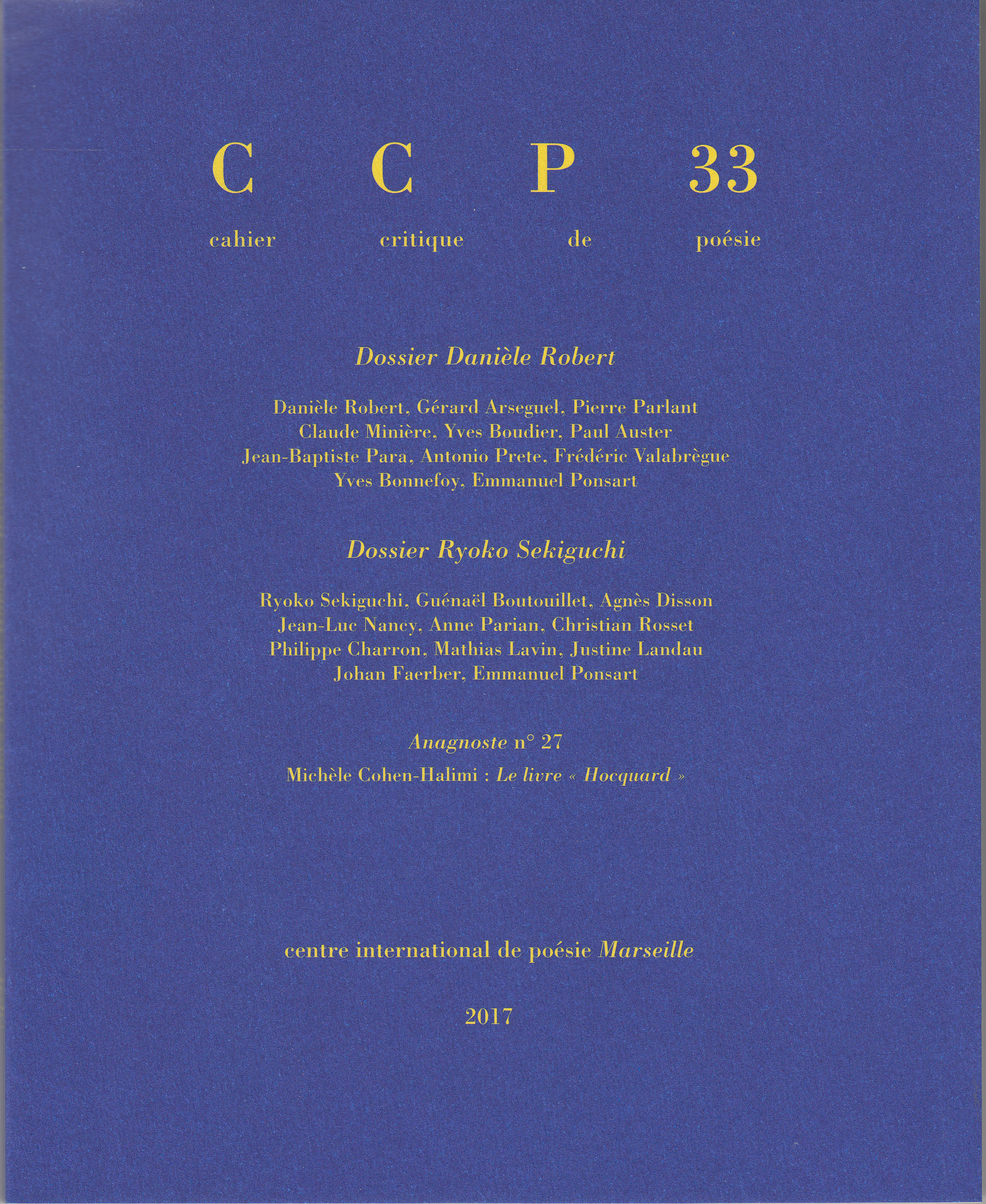 Dossier Danièle Robert : Gérard Arseguel - Danièle Robert, Joy d'amor (entretien) Pierre Parlant, Droit de gauchir Claude Minière, Commencer par l'Enfer Yves Boudier, À celle qui nous ouvrit l'Enfer Paul Auster, Lettre Jean-Baptiste Para - Danièle Robert, Légèreté et intériorité (entretien) Antonio Prete, Calvacanti et Dante dans l'atelier de poésie de Danièle Robert Frédéric Valabrègue, Au plus proche de la matière et du son Yves Bonnefoy, Lettre Emmanuel Ponsart, Bibliographie sommaire Dossier Ryoko Sekiguchi : Guénaël Boutouillet - Ryoko Sekiguchi, Entretien, décembre 2016 Agnès Disson, Petit dictionnaire Ryoko Sekiguchi Jean-Luc Nancy - Ryoko Sekiguchi, Conversation Anne Parian, Chère Ryoko... Christian Rosset, Tout - ou trois fois rien - sur Ryoko Philippe Charron, Parler la bouche pleine (même si c'est impoli) Mathias Lavin, Fade Justine Landau, En cuisine Johan Faerber, La Condition post mortem ou Dire la cuisine des morts chez Ryoko Sekiguchi Emmanuel Ponsart, Bibliographie sommaire Anagnoste n° 27 : Michèle Cohen-Halimi, Le livre "Hocquard"