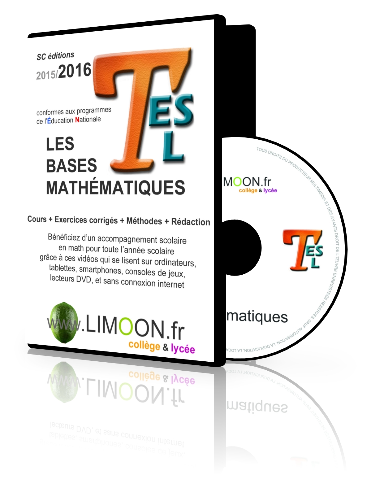 Soutien scolaire en MATH en vidéo pour les élèves de Terminale ES et L !!!! Merci de passer commande en envoyant un mél à limoon.fr@gmail.com !!!!!! @ Année scolaire 2016 - 2017 @ Cours + Exercices corrigés + Méthodes + Rédaction @ Conformes au programmes de l’Éducation Nationale @ Bénéficiez d’un accompagnement scolaire en math pour toute l’année scolaire grâce à ces vidéos qui se lisent sur ordinateurs, tablettes, smartphones, consoles de jeux, lecteurs DVD, et sans connexion internet Ce DVD-Rom d'une durée totale de 9 heures contient : 20 vidéos - 10 chapitres: - Suites- Continuité d'une fonction- Fonction exponentielle- Fonction logarithme- Fonctions convexes- Intégrales et primitives- Conditionnement et indépendance en probabilités- Probabilités - Lois à densité- Probabilités - Lois normales- Intervalles de fluctuation et d'estimation Chacun des 10 chapitres du programme se compose - d'une vidéo du Cours et - d'une vidéo avec les Exercices fondamentaux corrigés, les méthodes et la rédaction appropriée. Ces vidéos sont aussi disponibles en téléchargement sur mon site. A privilégier si vous habitez à l'étranger. @ Pendant les GRANDES VACANCES, ces vidéos sont un excellent moyen de préparer la prochaine rentrée scolaire. Les visuels des vidéogrammes présentés dans le site sont sujets à modification et ne peuvent en aucun cas être considérés comme des éléments contractuels.
