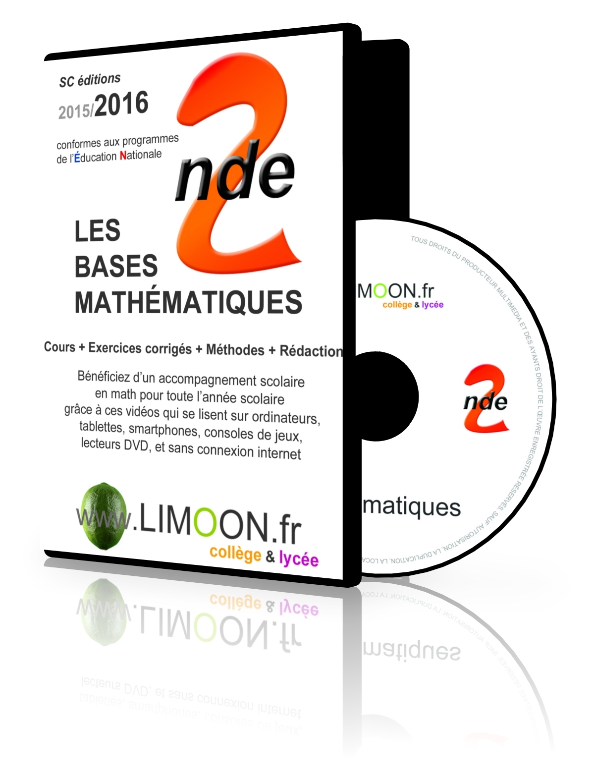Soutien scolaire en MATH en vidéo pour les élèves de Seconde !!!! Merci de passer commande en envoyant un mél à limoon.fr@gmail.com !!!!!! @ Année scolaire 2016 - 2017 @ Cours + Exercices corrigés + Méthodes + Rédaction @ Conformes au programmes de l’Éducation Nationale @ Bénéficiez d’un accompagnement scolaire en math pour toute l’année scolaire grâce à ces vidéos qui se lisent sur ordinateurs, tablettes, smartphones, consoles de jeux, lecteurs DVD, et sans connexion internet Ce DVD-Rom d'une durée totale de 8 heures et 23 minutes contient 28 vidéos et 14 chapitres : - Géométrie dans l'espace- Coordonnées d'un point du plan- Droites- Vecteurs- Fonctions- Étude de fonctions- Résolution d'équations- Fonctions de référence- Fonctions polynômes et homographiques- Inéquations- Trigonométrie- Probabilités- Statistique descriptive- Échantillonnage Chacun des 14 chapitres du programme se compose : - d'une vidéo du Cours et - d'une vidéo avec les Exercices fondamentaux corrigés, les méthodes et la rédaction appropriée. Ces vidéos sont aussi disponibles en téléchargement sur mon site. A privilégier si vous habitez à l'étranger. @ Pendant les GRANDES VACANCES, ces vidéos sont un excellent moyen de préparer la prochaine rentrée scolaire. Les visuels des vidéogrammes présentés dans le site sont sujets à modification et ne peuvent en aucun cas être considérés comme des éléments contractuels.
