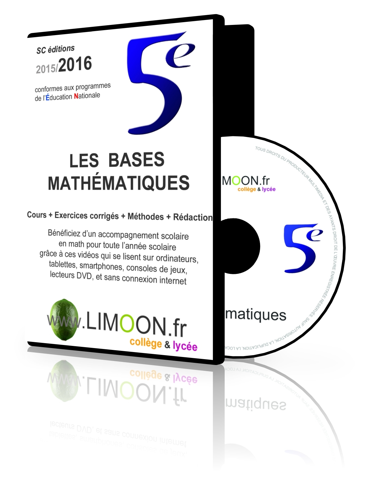 !ATTENTION ANCIENS PROGRAMMES! Accompagnement scolaire en MATH en vidéo pour les élèves de 5ème @ Année scolaire 2015 - 2016 !ATTENTION ANCIENS PROGRAMMES! @ Cours + Exercices corrigés + Méthodes + Rédaction @ Conformes au programmes de l’Éducation Nationale @ Bénéficiez d’un accompagnement scolaire en math pour toute l’année scolaire grâce à ces vidéos qui se lisent sur ordinateurs, tablettes, smartphones, consoles de jeux, lecteurs DVD, et sans connexion internet Ce DVD-Rom contient: 23 vidéos - 12 chapitres : - Symétrie centrale- Triangle- Angles particuliers- Parallélogramme- Géométrie dans l'espace- Enchainement d'opérations- Nombres relatifs- Addition de nombres relatifs- Écriture fractionnaire- Opérations et fractions- Proportionnalité- Organisation de données* Chacun des 15 chapitres du programme sauf * se compose : - d'une vidéo du Cours et - d'une vidéo avec les Exercices fondamentaux corrigés, les méthodes et la rédaction appropriée. Ces vidéos sont aussi disponibles en téléchargement sur mon site. A privilégier si vous habitez à l'étranger. @ Pendant les GRANDES VACANCES, ces vidéos sont un excellent moyen de préparer la prochaine rentrée scolaire. Les visuels des vidéogrammes présentés dans le site sont sujets à modification et ne peuvent en aucun cas être considérés comme des éléments contractuels.